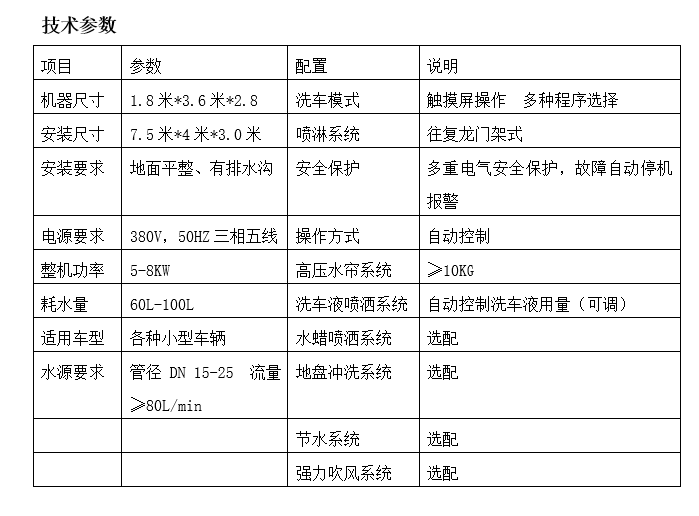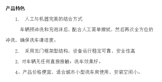 全自动无接触高泡洗车、高压水、泡沫、水蜡。当在大城市中店主受洗车房空间限制或者受到投资费用限制,也可以限制半自动洗车机,市场上功能好的半自动洗车机,只需要人工泡沫擦洗,其他过程如喷洒泡沫清洗剂、高压水冲洗等全部可由机器自动完成。